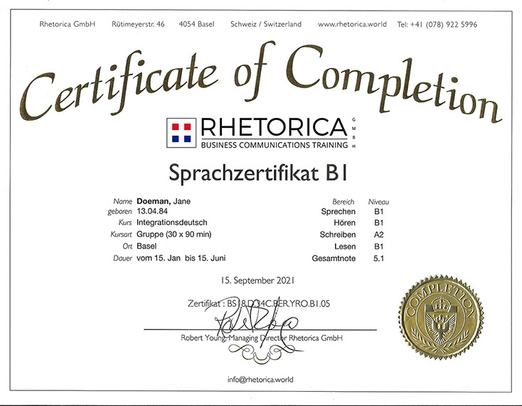 Rhetorica Certificates of Completion are composite snapshots of students' real communication skills over time: realistic and accurate. Prospective employers can request confirmation from Rhetorica GmbH at any time in the future.